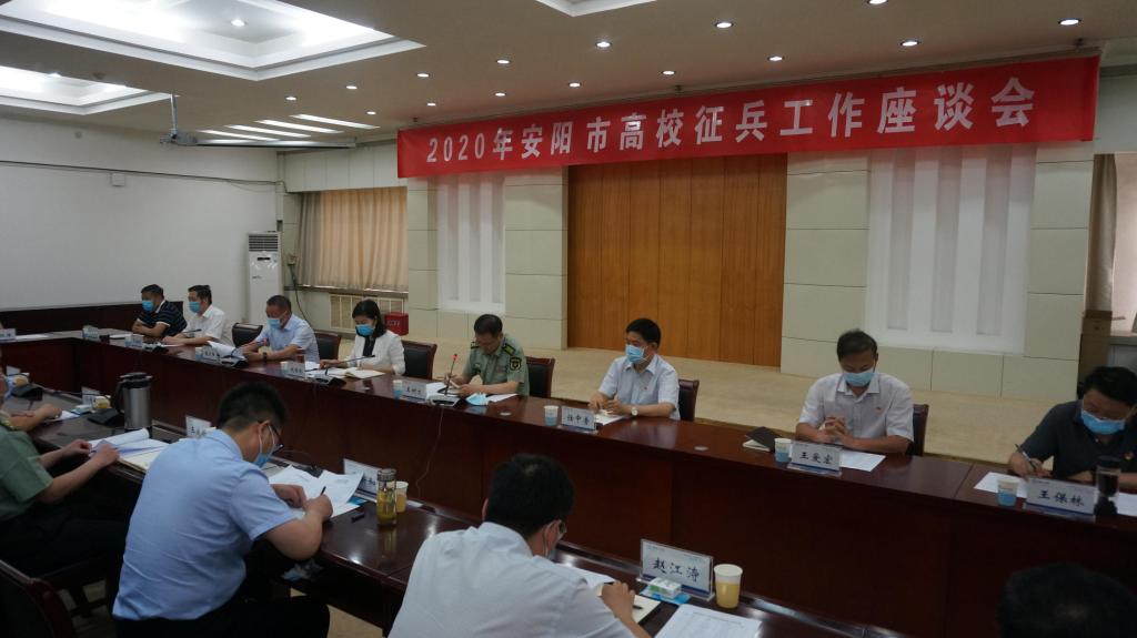 6月12日下午,2020年安阳市高校征兵工作座谈会在安阳工学院行政楼四楼会议室举行。安阳军分区司令员王树文主持会议,副市长祝振玲出席会议并讲话。我校领导任中普、孙保平及我市其他5所高校领导及市征兵办成员参加了座谈会。