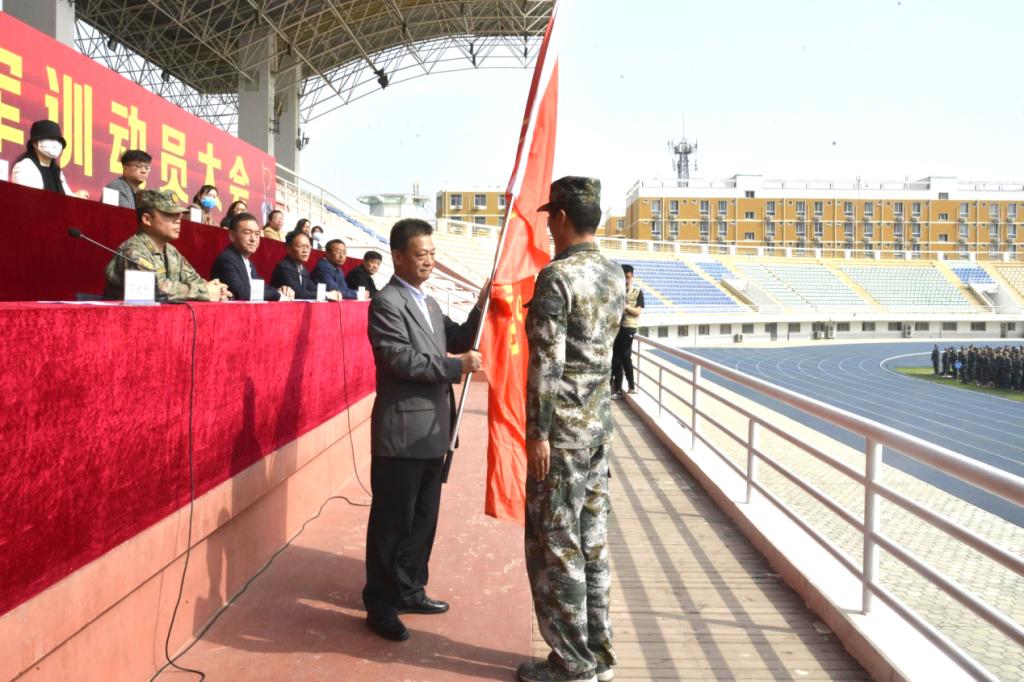 大会最后,蒋文龙为承训单位授2022级军训团旗。