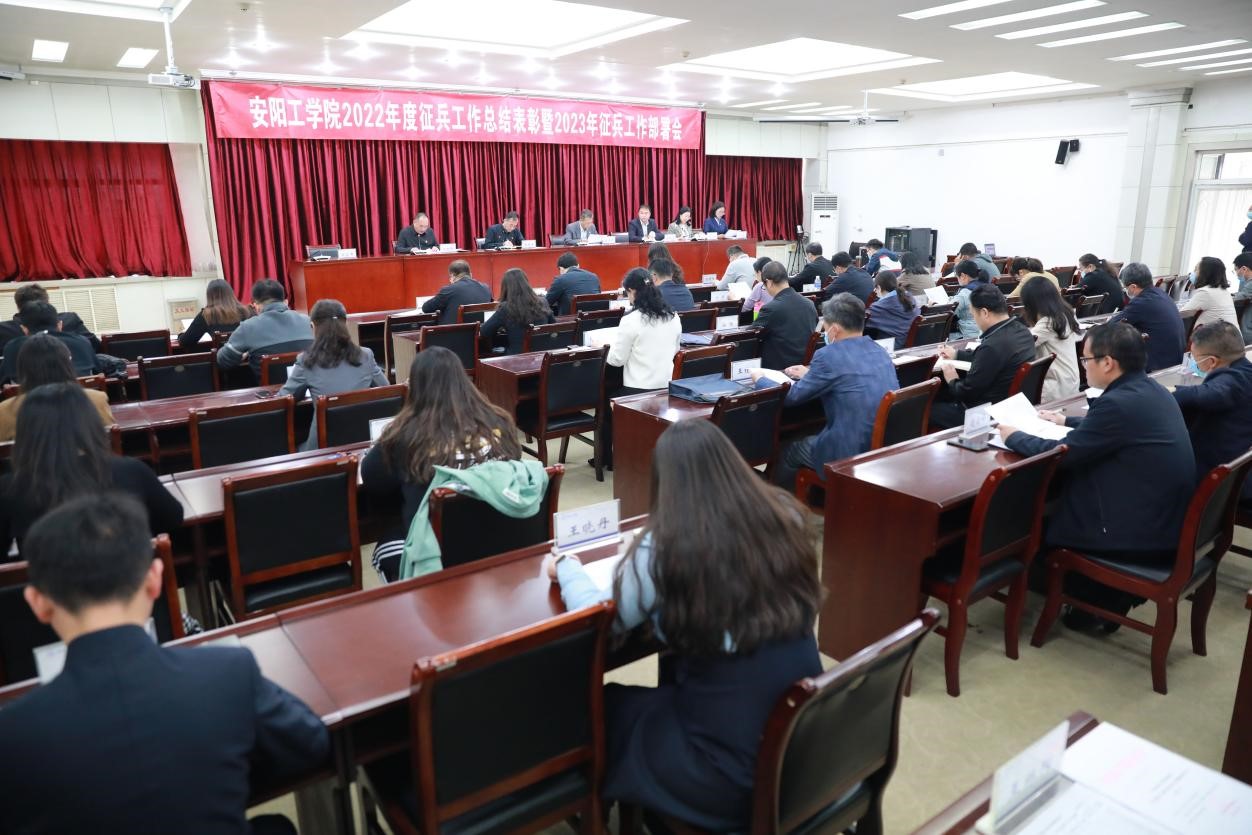 刘韶晖总结了2022年度征兵工作完成情况,并对2023年征兵工作进行了安排部署。学生工作部部长王振宇宣读了《关于表彰2022年度征兵工作先进单位和先进个人的决定》。与会领导为机械工程学院等11个2022年度征兵工作先进单位颁发了奖牌,并为11名获得安阳市征兵工作优秀辅导员的老师颁发了荣誉证书。艺术设计学院党总支书记凌云峰代表先进单位发言,飞行学院团总支副书记师路路代表先进个人发言。