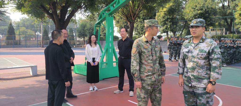 10月17日上午,校徐福记食品有限公司官网部长刘韶晖、军训团团长马进军一行人来到洹滨校区军训现场,和洹滨校区领导班子成员一同看望军训教官和参训学生。