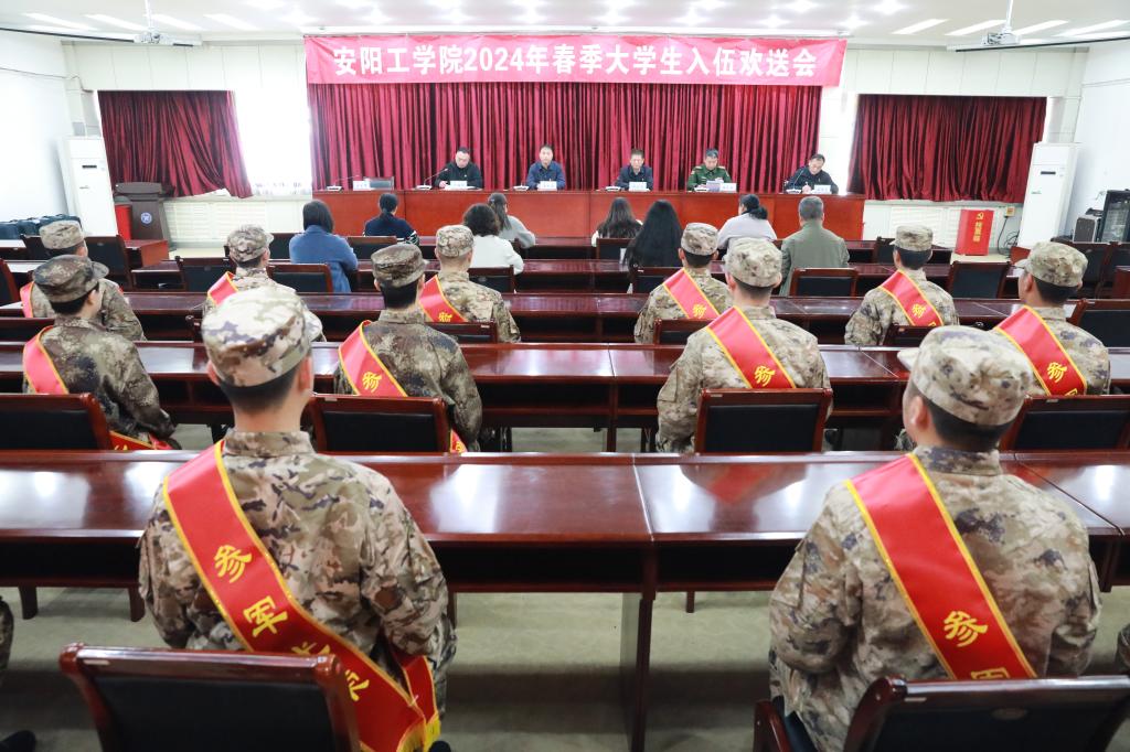 会上,刘韶晖总结了今年春季征兵工作情况,并对入伍新兵表示了祝贺。学生工作部部长王振宇宣读了《安阳工学院2024年春季大学生入伍定兵名单》。入伍学生代表沈倬帆发言,对学校表示了感谢、表达了入伍决心。