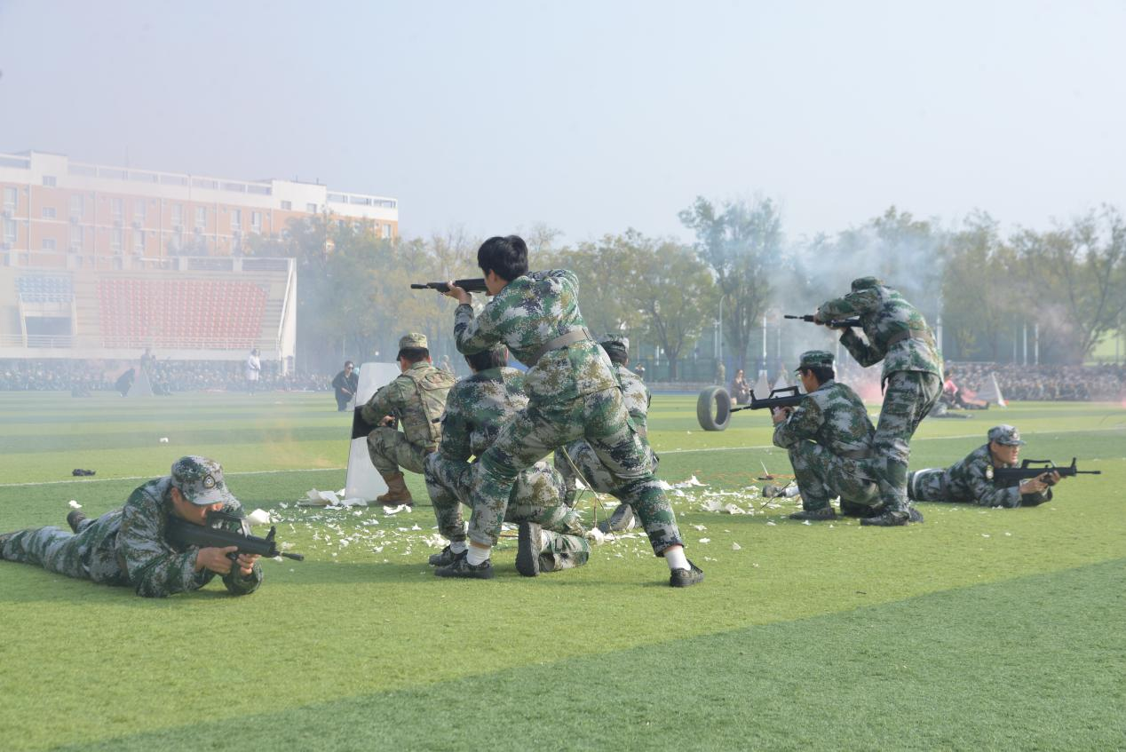 在激昂的检阅进行曲中,分列式表演率先开启。各学院新生方阵步伐整齐、口号铿锵,以规范的动作和饱满的精神状态依次通过主席台。在汇报表演环节,各参训方阵依次进行了军体拳、匕首操、刺杀操、格斗术、战术等多项科目演练,同学们动作刚劲利落、气势昂扬振奋,全面展示了为期21天的军事训练成果,彰显了安工学子奋发向上的青春风貌。